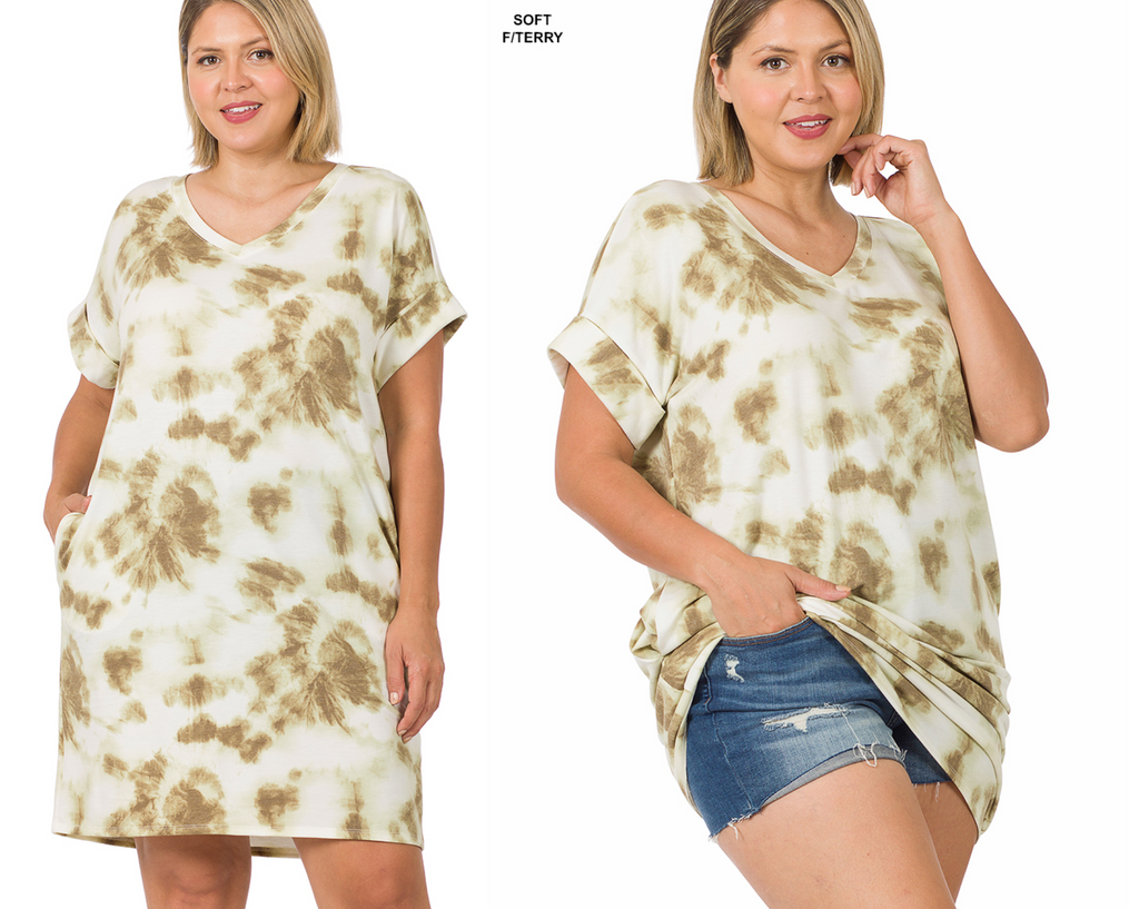 SOFT FRENCH TERRY TIE DYE ROLLED SHORT SLEEVE V-NECK DRESS WITH SIDE POCKETS