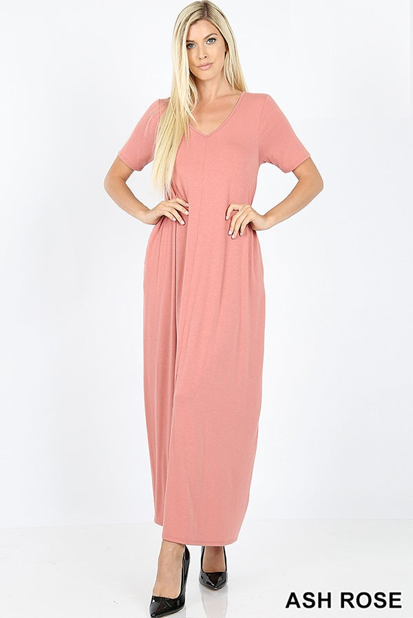 V-NECK SHORT SLEEVE MAXI DRESS WITH SIDE POCKETS