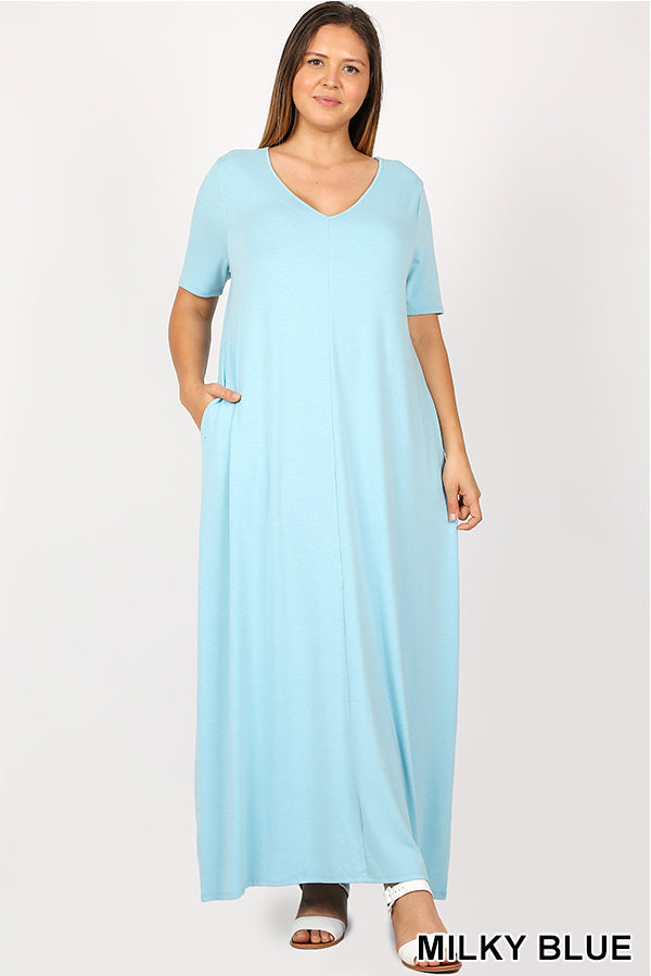 V-NECK SHORT SLEEVE MAXI DRESS WITH SIDE POCKETS