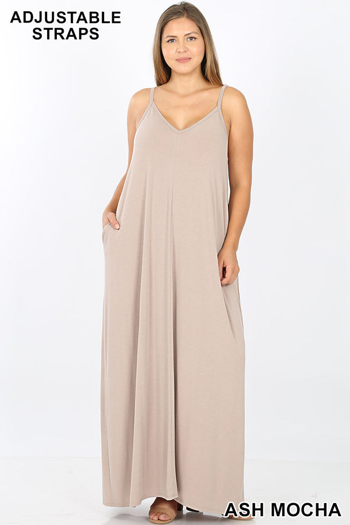 V-NECK ADJUSTABLE STRAPS CAMI MAXI DRESS WITH SIDE POCKETS