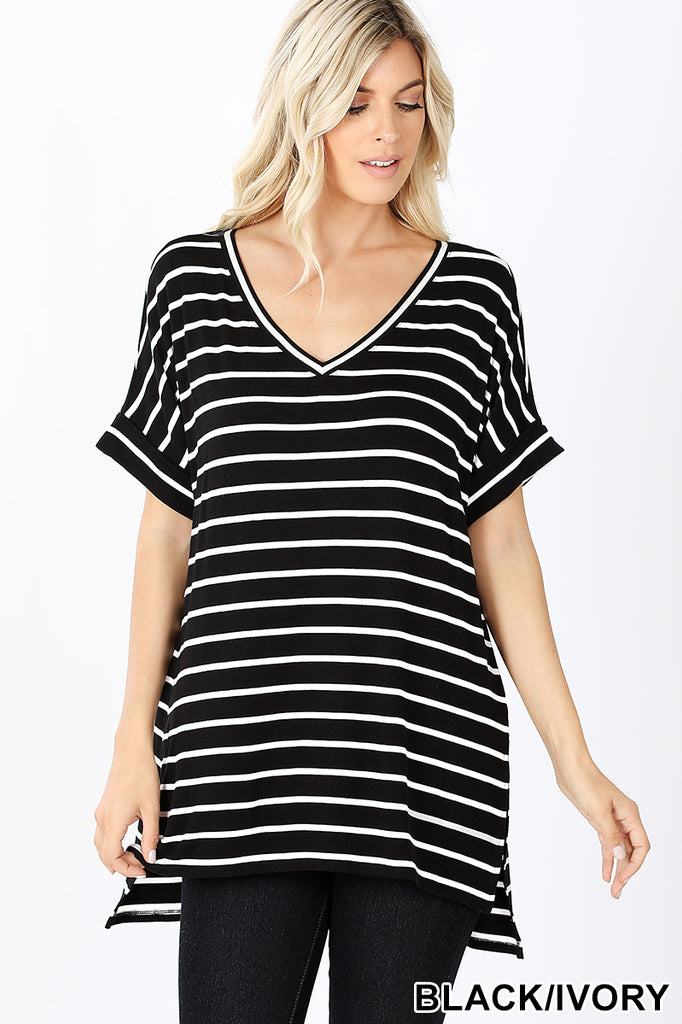 OVERSIZED STRIPE ROLLED SHORT SLEEVE V-NECK TOP WITH SIDE SLIT HIGH-LOW HEM