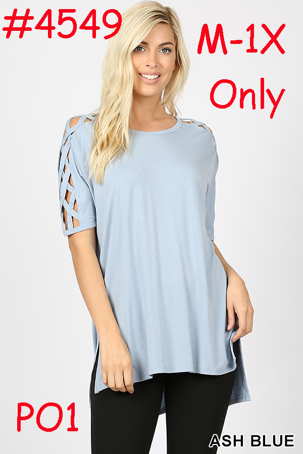 4549 1/4S Criss Cross Shoulder HiLo Hem TOP in ASH BLUE