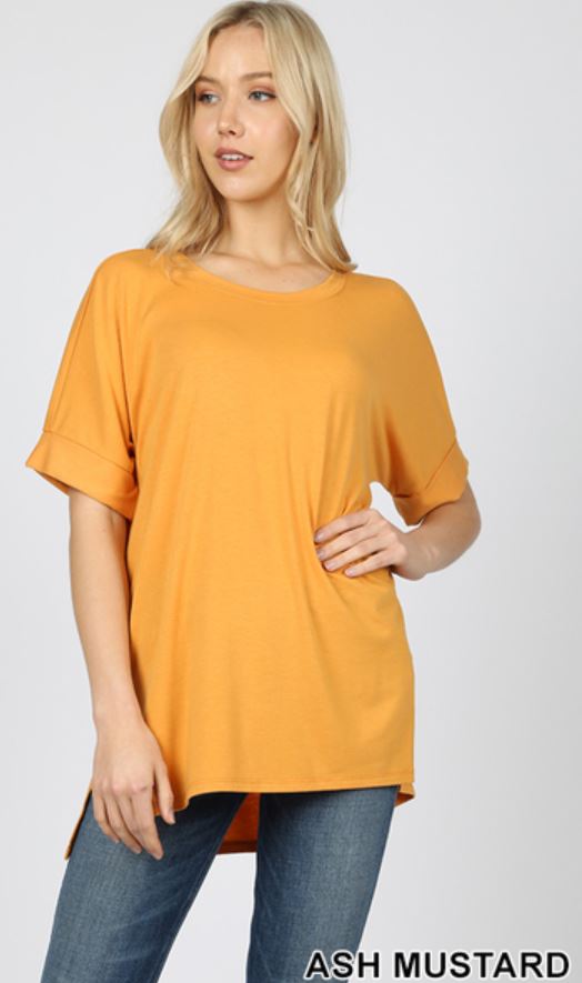 4642 1/4S Rolled R Neck HiLo Side Slit TOP in ASH MUSTARD